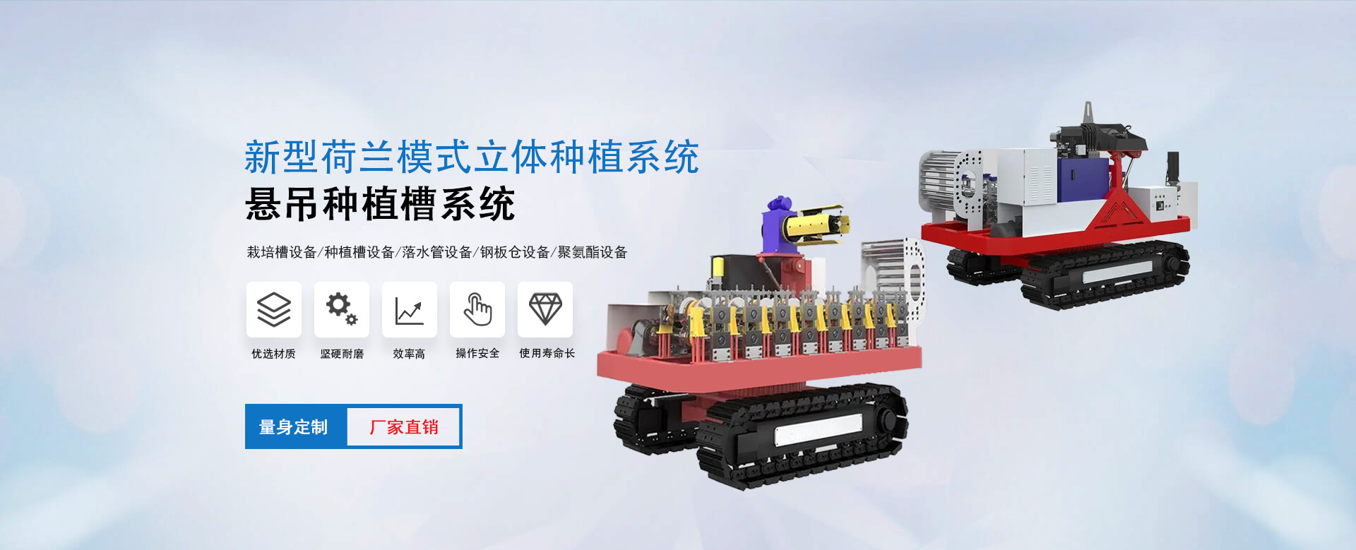 雄博機械主營:種植槽設備/栽培槽設備/草莓栽培槽/新型立體種植槽/草莓無土栽培設備/草莓立體種植系統(tǒng)/懸吊種植槽系統(tǒng)/落水管設備/鋼板倉設備/聚氨酯設備等。