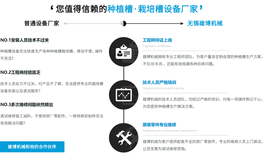 您在選擇雄博產(chǎn)品的同時,也選擇無微不至的終身服務。可根據(jù)不同客戶實際需求進行種植槽設備,栽培槽設備等的特殊工藝設計制造專業(yè)一對一售前/售后/技術咨詢指導,享受更貼心/放心的設備使用體驗。